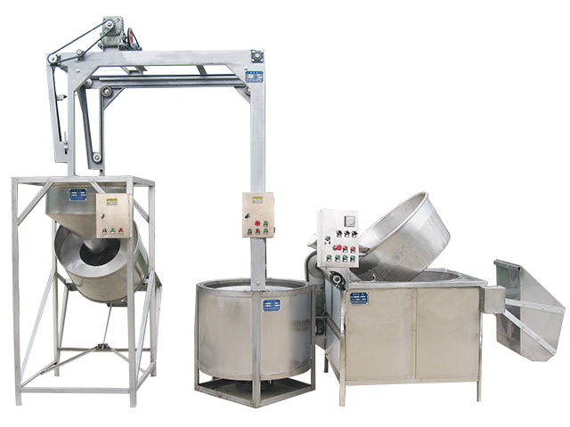 油炸機(jī):對(duì)物料進(jìn)行油炸,接觸物料部分為304材質(zhì),帶有自動(dòng)控溫裝置,自動(dòng)出料,可帶自動(dòng)上料和自動(dòng)攪拌功能。