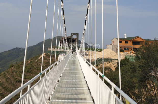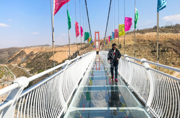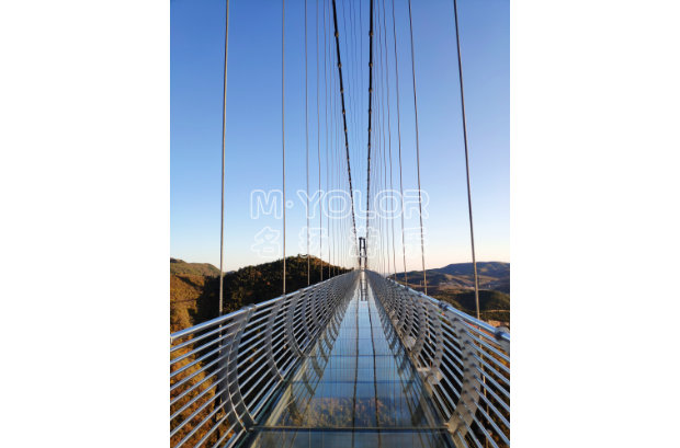 由鋼化玻璃凌空高架在懸崖峭壁上形成懸空透明的玻璃景觀橋,兼具通行、觀景、娛樂、T臺(tái)為一體,玻璃透光率高達(dá)99.15%。玻璃吊橋的險(xiǎn)與美得巧妙結(jié)合,打破傳統(tǒng)旅游觀景模式,全方位,各角度觀賞景色。平臺(tái)鋪設(shè)全透明玻璃,位于近百米高的懸崖峭壁之上,山河壯闊 人間煙火竟在眼前。